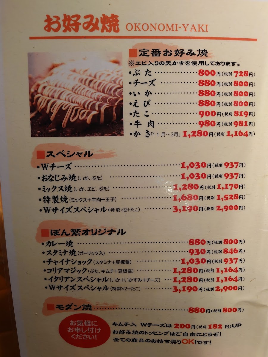 From a reviewer’s perspective, the takeaway menu at Okonomiyaki Bonshige is concise but clearly designed for sharing and casual enjoyment. The パーティーパック 3.4人用 stands out as a convenient option for small groups, while the larger パーティーパック 5.6人用 caters well to bigger gatherings, suggesting flexibility depending on party size. Additionally, the offering of たこ焼きのようなもの adds a playful twist, hinting at a takoyaki-style dish that complements the restaurant’s overall theme. Although specific prices are not listed, the menu emphasizes practicality and group dining, making it appealing for those seeking easy, shareable takeaway options rather than an extensive selection.